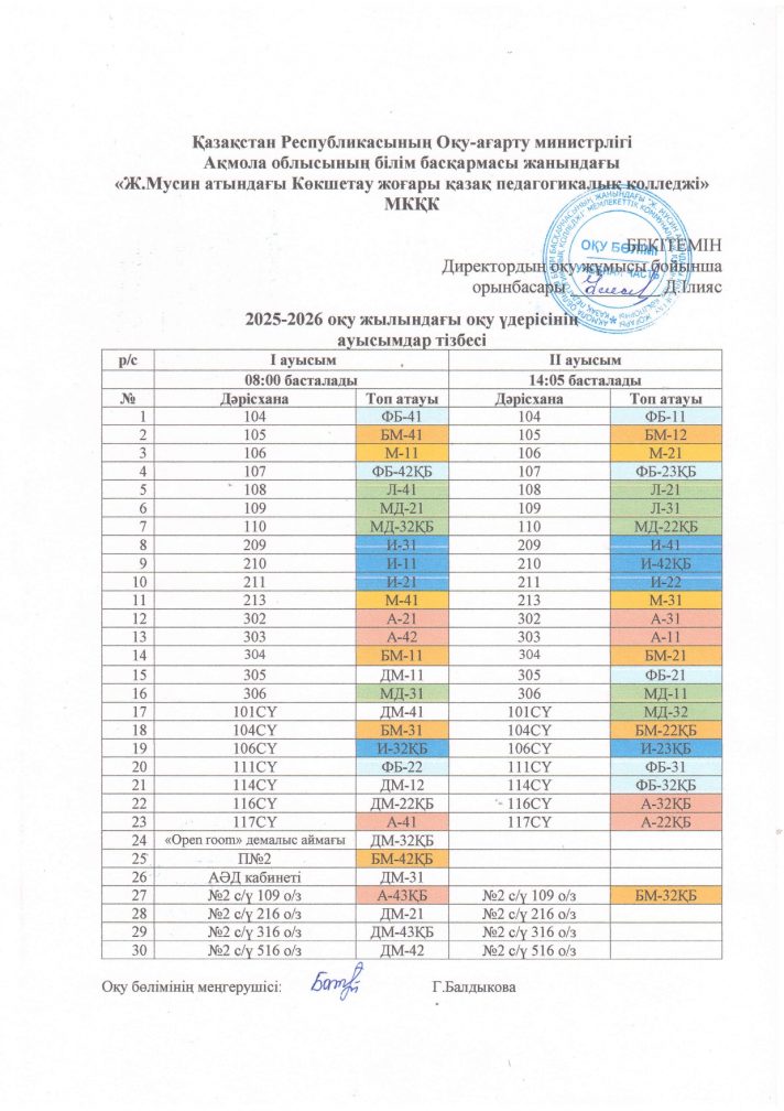 2025-2026 оқу жылындағы оқу үдерісінің ауысымдар тізбесі