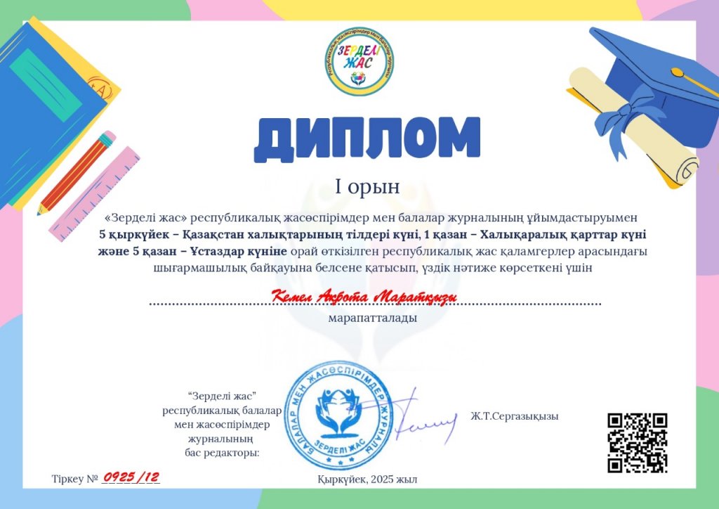 «Зерделі жас» республикалық жасөспірімдер мен балалар журналының ұйымдастыруымен 5 қыркүйек – Қазақстан халықтарының тілдері күні, 1 қазан – Халықаралық қарттар күні және 5 қазан – Ұстаздар күніне орай өткізілген республикалық жас қаламгерлер арасындағы шығармашылық байқауына Ж.Мусин атындағы Көкшетау жоғары қазақ педагогикалық колледжінің студенттері белсене қатысып, үздік нәтиже көрсетті. «Филология» бөлімінің ІІ курс студенттері Кемел Ақбота, Турегельдина Томирис, Абдраманов Арсланбек және «Мектепке дейінгі тәрбие және оқыту» бөлімінің І курс студенті Жанибек Самрық жүлделі І орынды иеленді. Жетекшілері: Қайыржан Тілек Сағындыққызы мен Қаржау Айсара Қожабекқызы. Құттықтаймыз! Жеңісті күндер көп болсын!