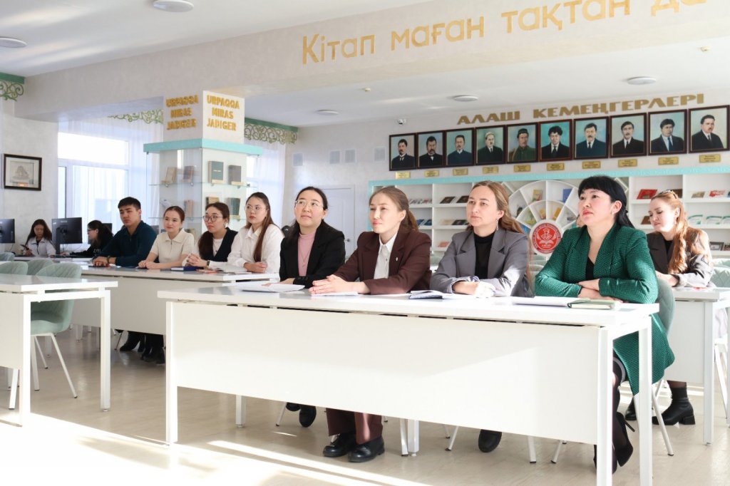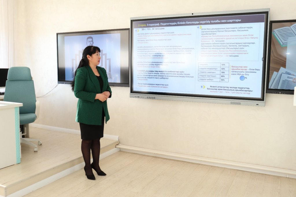 Колледж әдіскері Сабырова Әсем Бекешқызы «Педагогтердің аттестаттаудан өту қағидаттары» тақырыбында баяндама жасап, аттестаттау рәсімдерінің тәртібі мен бағалау критерийлеріне тоқталды.