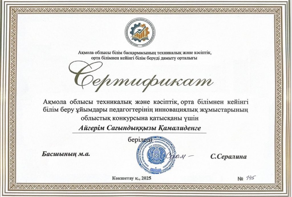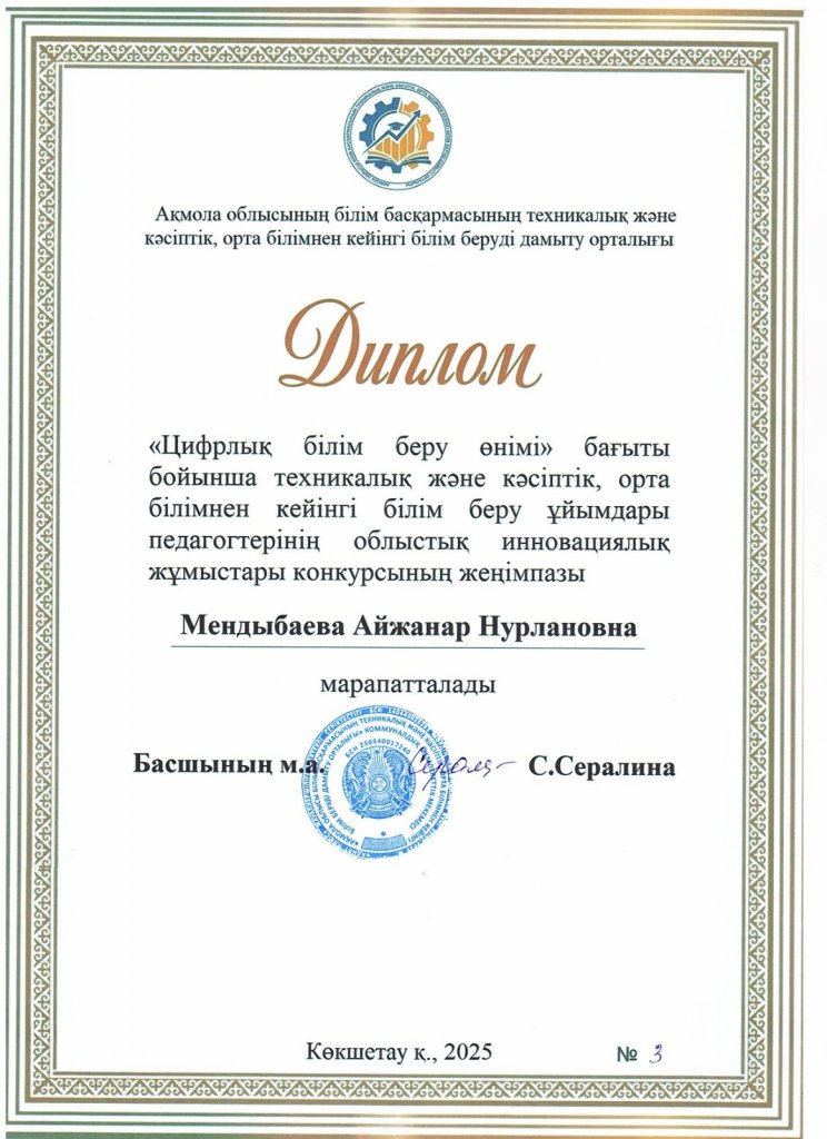 Мендыбаева Айжанар Нұрланқызының «Цифрлық педагогтің Digital-гайды» атты цифрлық өнімі І жүлделі орынға ие болып, республикалық кезеңге жолдама алды. Ал Қамалиден Айгерім Сағындыққызының «Білім берудегі менеджмент және цифрландыру» атты жұмысы сертификатпен марапатталды.