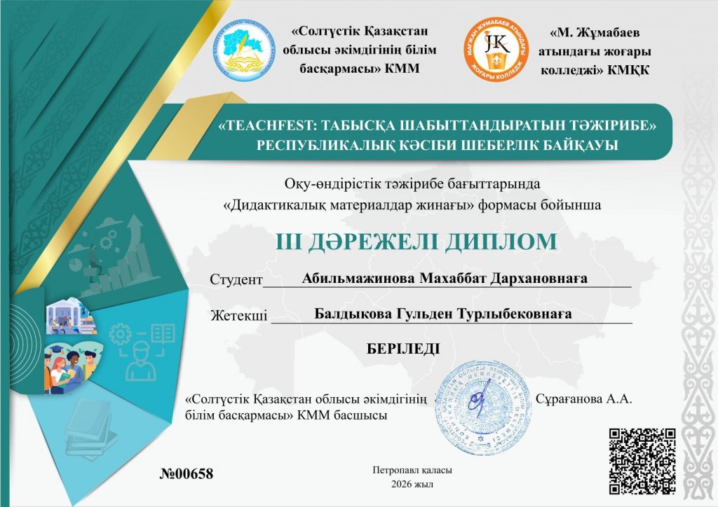 Солтүстік Қазақстан облысының білім басқармасы бекіткен байқаулар тізіміне сәйкес, 2026 жылдың 20–27 қаңтар аралығында «Солтүстік Қазақстан облысы әкімдігінің білім басқармасы» КММ мен «М. Жұмабаев атындағы жоғары колледж» МКҚК-ның ұйымдастыруымен оқу-өндірістік практика блогі бойынша «TeachFest: табысқа шабыттандыратын тәжірибе» республикалық кәсіби шеберлік байқауы өтті.