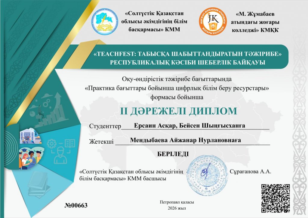 Ал «Практика бағыттары бойынша цифрлық білім беру ресурстары» бағыты бойынша информатика бөлімінің студенттері Ерсаин Асқар мен Бейсен Шыңғысхан ІІ орынға ие болды. Жетекшісі – Мендыбаева Айжанар Нұрланқызы.